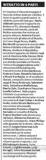 Norberto Bobbio è uno dei pochissimi filosofi politici italiani del nostro tempo che ha saputo conquistare un grande prestigio internazionale e incidere con i suoi scritti sulla riflessione di studiosi appartenenti ai più diversi contesti culturali: lo dimostra concretamente il nuovo numero di Reset interamente dedicato a Bobbio, che esce venerdì, in cui si segnalano in particolare i contributi di Perry Anderson, Jean Cohen e Andrew Arato, Anne Phillips e Jürgen Habermas. Naturalmente l´opera di Bobbio è consultabile in tutte le maggiori biblioteche americane, inglesi, tedesche, francesi e spagnole, per limitare la ricerca alle principali aree culturali occidentali e constatare il numero davvero notevole delle opere tradotte nelle diverse lingue. La cosa è di per sé straordinaria, per l'ovvia ragione che nella filosofia politica l'Italia non è più, da secoli, centro di elaborazione e irradiazione di idee e teorie ma periferia. Una provincia periferica che traduce, assorbe, rielabora, con maggiore o minore maestria, ma pur sempre una provincia minore rispetto all'area culturale dominante, che è quella anglosassone, e rispetto alla Germania e alla Francia.